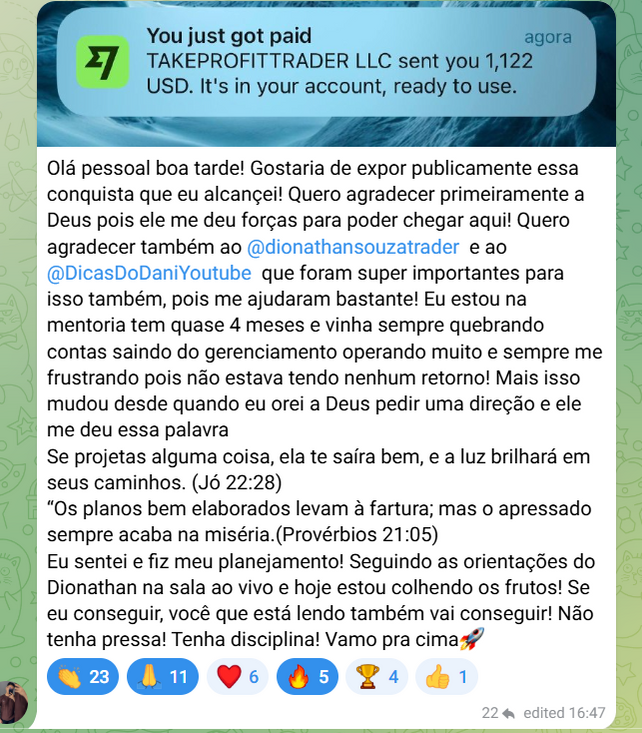 Hoje, é mentor de centenas de traders aprovados em mesas proprietárias, com mais de 30 contas aprovadas e 20 saques realizados.